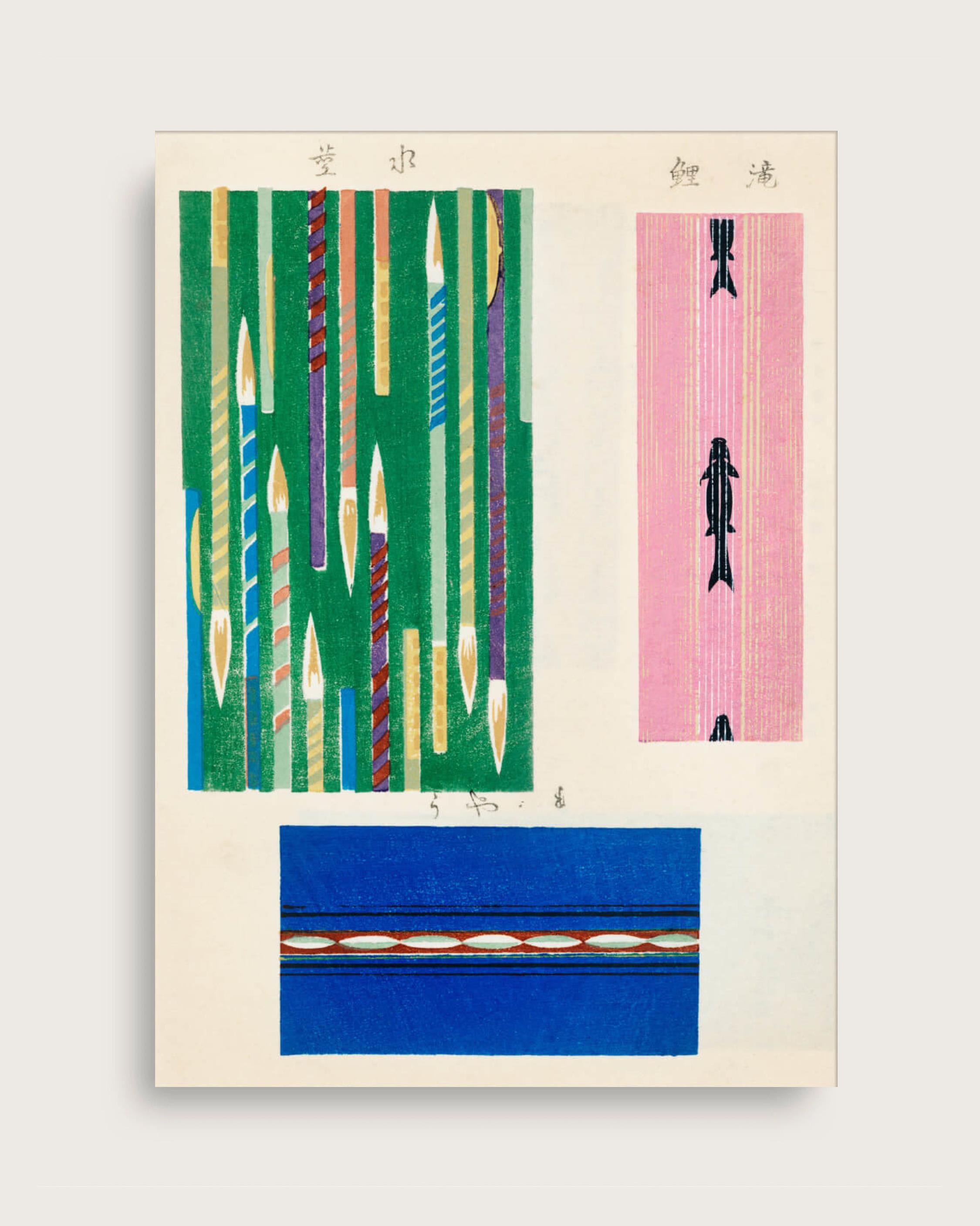 Japanese print from the Shima-Shima series. With several textile patterns gathered on one surface, consisting of stripes, repeated shapes and decorative elements in green, blue and pink shades. The motifs are based on traditional Japanese textile patterns and ornamentation.