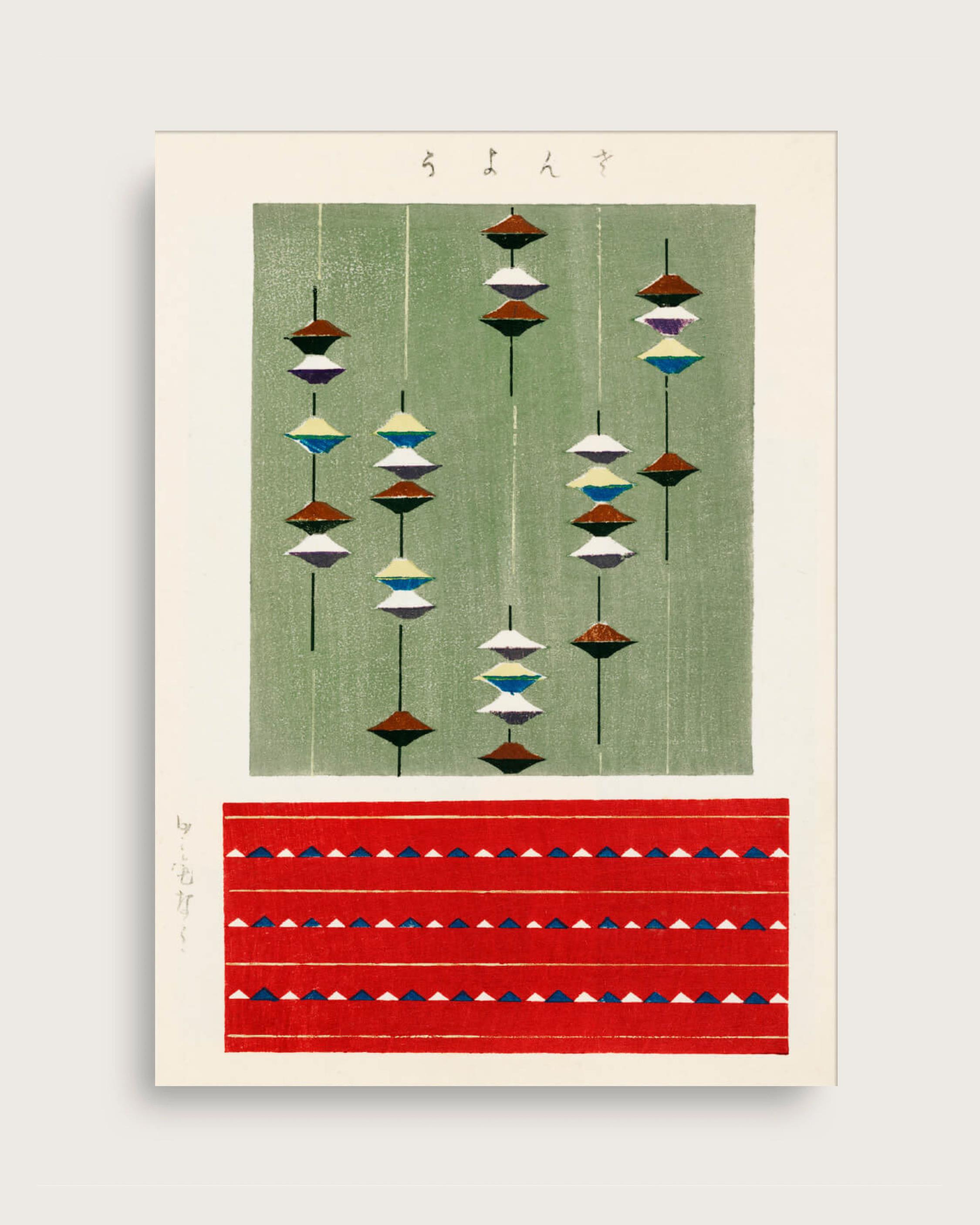 Japansk print fra serien Shima-Shima. Med flere tekstilmønstre samlet på én flade, bestående af striber, gentagne former og dekorative elementer. Motiverne tager udgangspunkt i traditionelle japanske tekstilmønstre og ornamentik.