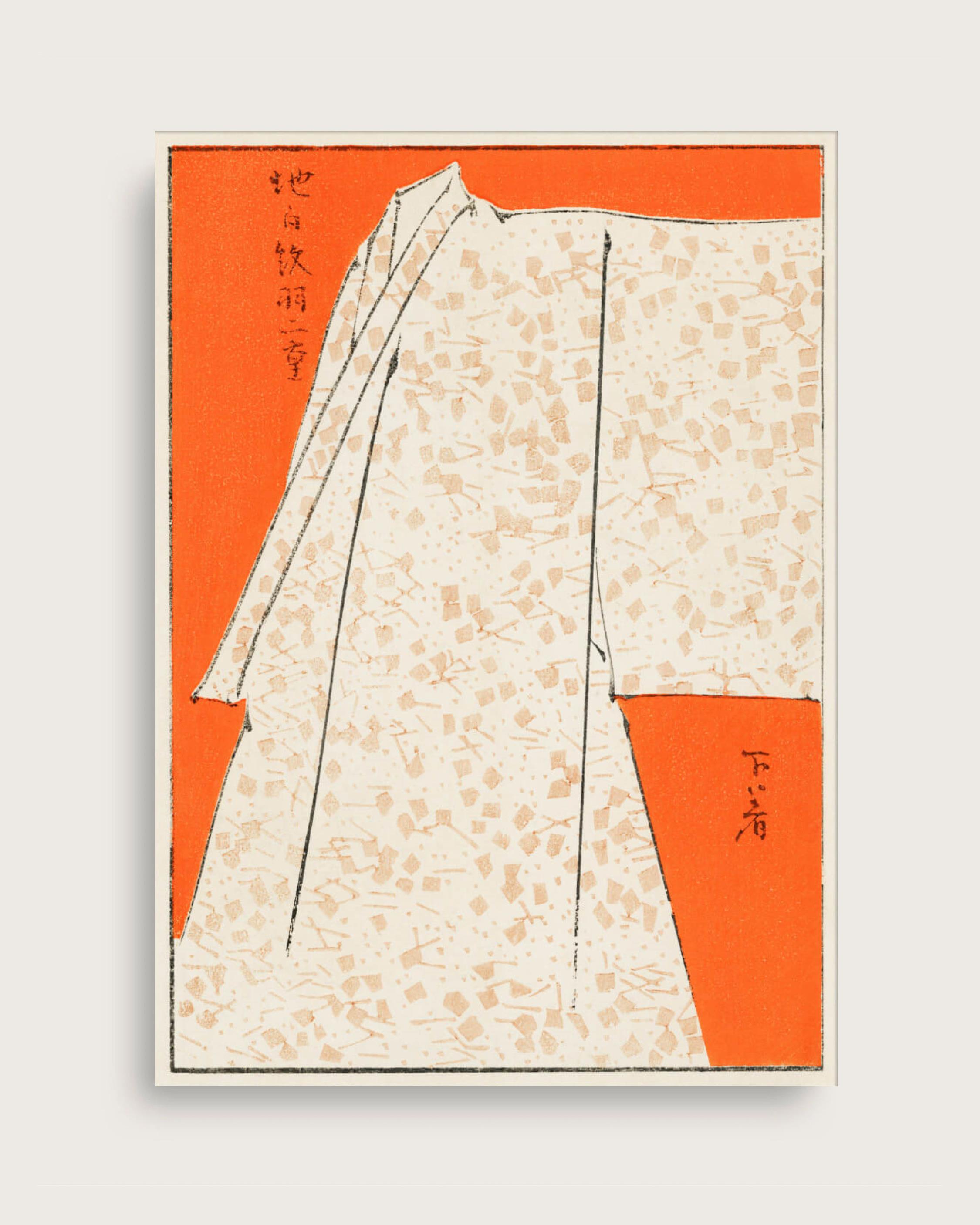 Japansk print med en stiliseret kimono gengivet i lyse, mønstrede flader mod en varm, orange baggrund. Motivet er enkelt opbygget med klare konturer og fine teksturer.