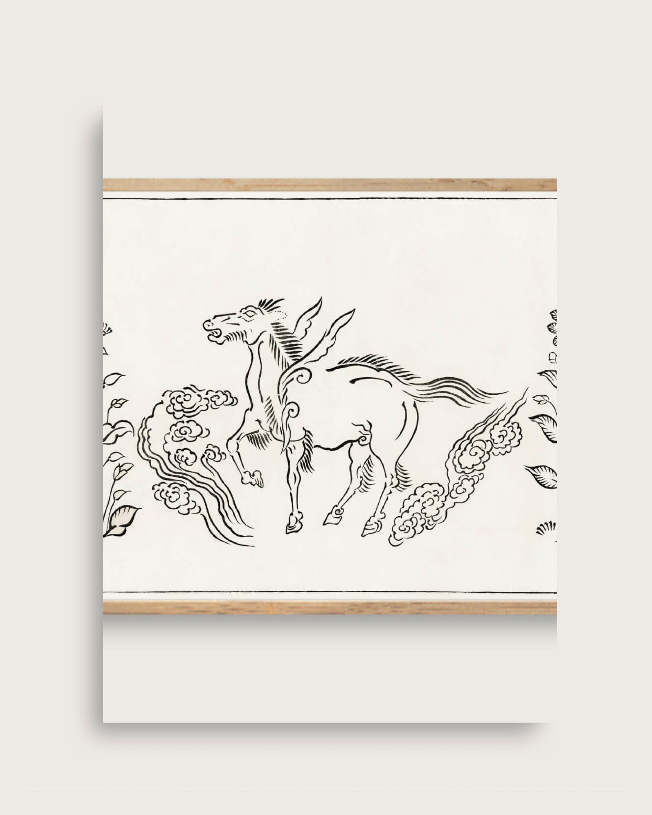 Elegant japansk kunstprint med en mytisk bevinget hest, udført i fine, grafiske penselstrøg i sort tusch. Motivet er omgivet af stiliserede skyer og blomster, som skaber en harmonisk balance mellem bevægelse og ro.